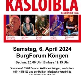 Am 6. April wird wieder die Bühne im Köngener BurgForum gerockt, dieses Jahr mit der Gruppe „KäSLOIBLA“. Zum Repertoire gehören die Classic Rocks und Oldies wie Jumpin’ Jack Flash, Sultans of Swing, Cocaine, Suzie Q, Born to be wild, La Grange, Pinball Wizard, Mighty Quinn, Lay Down Sally, The Joker,[…]
