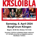 Am 6. April wird wieder die Bühne im Köngener BurgForum gerockt, dieses Jahr mit der Gruppe „KäSLOIBLA“. Zum Repertoire gehören die Classic Rocks und Oldies wie Jumpin’ Jack Flash, Sultans of Swing, Cocaine, Suzie Q, Born to be wild, La Grange, Pinball Wizard, Mighty Quinn, Lay Down Sally, The Joker, While my Guitar gently weeps und viele andere.