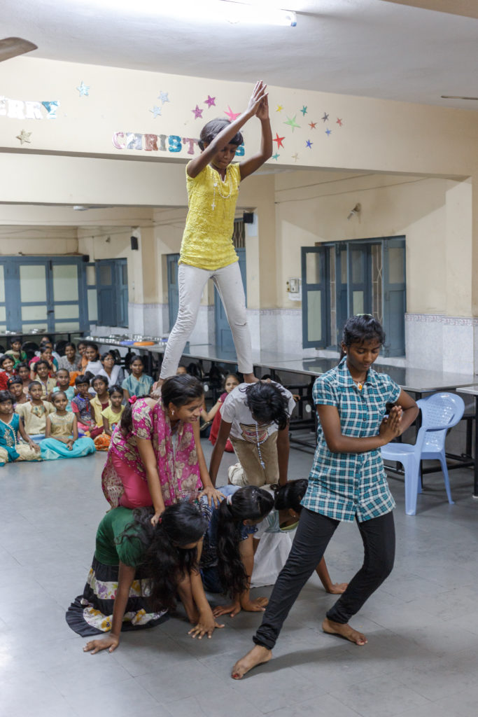 Anschließend fahren wir zu einem Heim für Straßenkinder. Nach einer sehr herzlichen Begrüßung und einigen überwältigenden Tanzaufführungen wurden wir mit den Details konfrontiert. Das Heim wurde im Jahr 2000 gegründet und startete mit 15 Mädchen. Zurzeit leben hier 85 Mädchen, welche von der Polizei auf der Straße aufgegriffen und hier hergebracht wurden. Die meisten Mädchen sind in der Regel Vollwaisen, einige wenige Halbwaisen. Meistens lebt dann nur noch die Mutter, die nicht ausreichend für ihre Kinder sorgen kann, so dass diese gezwungen wären zu betteln oder zu arbeiten. An eine Schulbildung wäre überhaupt nicht zu denken. Einige der Mädchen leben hier zusammen mit ihren Schwestern. Brüder hingegen werden in ein eigenes Boys-Hostel gebracht. Trotz Recherchen ist es leider nicht immer möglich, die Geschwister ausfindig zu machen, so dass die Geschwister keinen Kontakt haben und die Erinnerung an die Familie verblasst. Denn viele der Mädchen sind schon seit früher Kindheit mit fünf oder sechs Jahren aufgenommen worden und leben teilweise schon bis zu elf Jahre hier. Sofern es möglich ist, besuchen die Mütter ihre Kinder ein Mal im Monat.