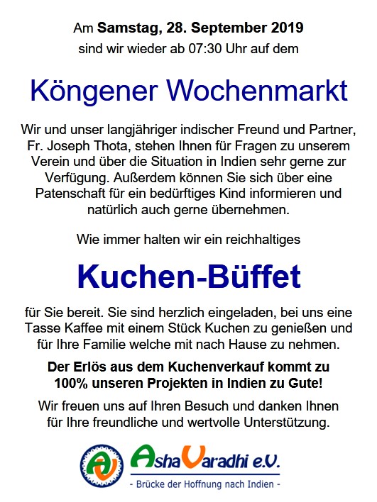 An unserem Infostand können Sie unseren langjährigen Freund und Partner, Fr. Joseph Thota, aus Indien wiedersehen oder kennen lernen. Er und wir stehen Ihnen für Fragen zu unserem Verein und über die Situation in Indien sehr gerne zur Verfügung.