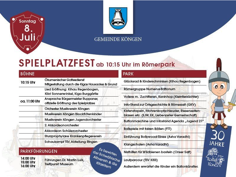 Wir beteiligen uns morgen am Sonntag 8.7.2018 am Spielplatzfest im Römerpark in Köngen von 10:15 – 17:00 Uhr und freuen uns wenn ihr bei uns vorbeischaut.