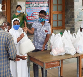 Einen Teil der erhaltenen Spenden haben wir Sr. Rajamma zur Verfügung gestellt. Sie und ihrer Helfer*innen haben eine Vielzahl von Tüten mit Grundnahrungsmittel wie Reis, Zwiebeln u.ä. zusammengestellt und in einer Aktion an die Armen in Karunapuram verteilt.