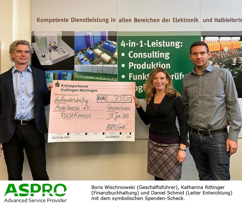 Traditionell sammeln ASPRO und ihre Mitarbeiter vor Weihnachten Spenden für einen gemeinnützigen Zweck. Die Mitarbeiter machen Vorschläge, aus denen dann der Spendenempfänger per Los ermittelt wird. Die beiden Köngener Daniel Schmid und Tilmann Welsch haben Asha Varadhi e.V. vorgeschlagen und das Losglück stand dann auf unserer Seite.
